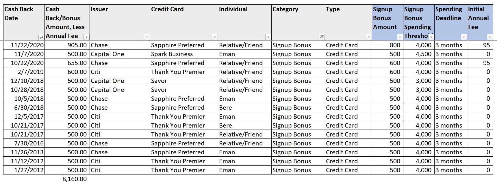 I’ve earned over $14,000 in credit card rewards since I started tracking my cash back about 9 years ago, but more than half of that total, or $8,160, came specifically from credit card sign up bonuses:
