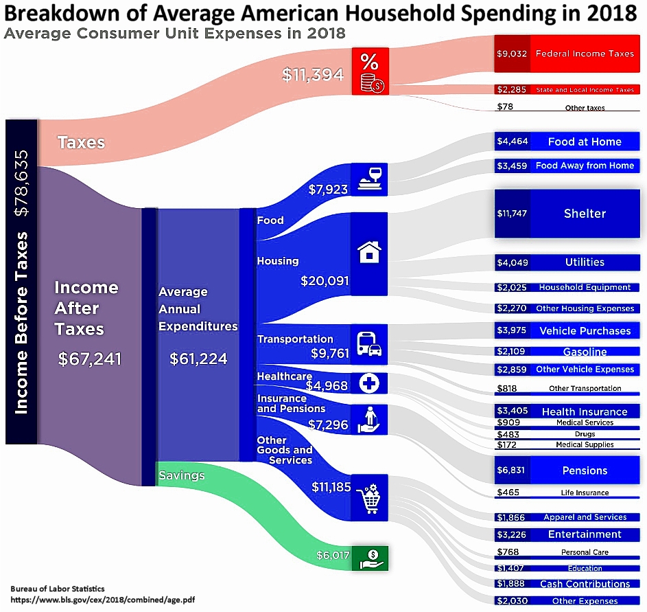 The average American household has $61,224 a year in expenditures according to the most recently available report from the Bureau of Labor Statistics: