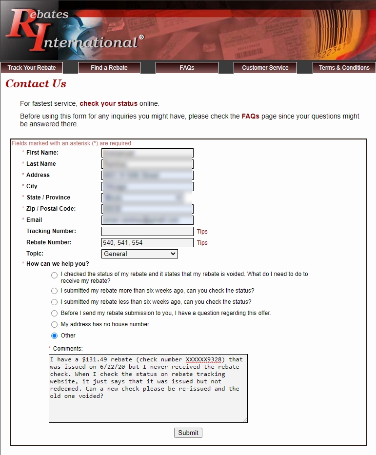 A few days after I submitted my message I received an email response that a new rebate check would be re-issued. Not sure how many people this information might be helpful to, but I figured since this also happened to my parents a couple years ago, this could probably be a little more common than people realize.