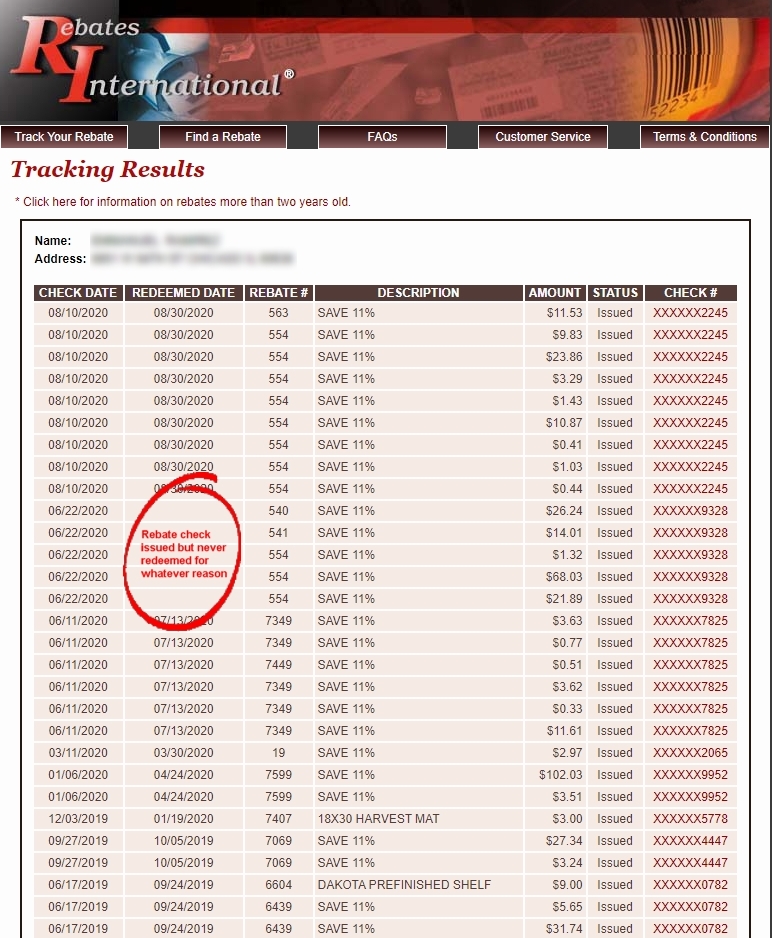 I don’t know how many human beings actually track their rebates from Menards, but since I mailed in a bunch of rebates over the summer I figured I should probably take a look so I entered my name and address into their rebate tracker and discovered there was a rebate check issued in June that I never received for whatever reason: