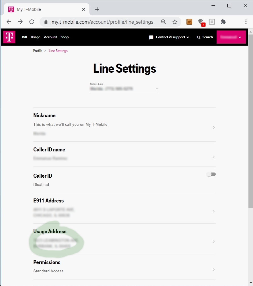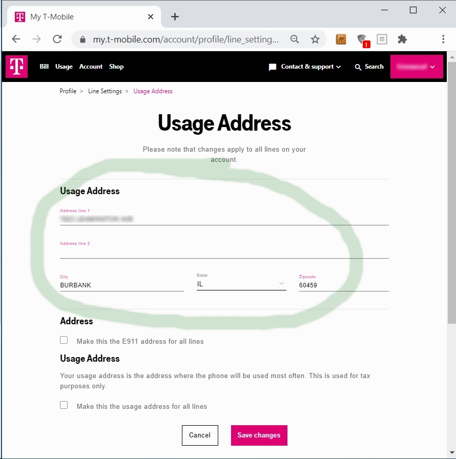 T-Mobile is my cell phone provider so I logged into my online account and went to the “Line Settings” under my Profile and clicked on “Usage Address” for the phone lines I wanted to update: