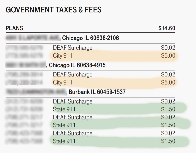 The phone lines on my family plan that were listed with a suburban address were getting charged the State 911 fee which is only $1.50/month but the two other phone lines that were listed with a Chicago address were getting charged $5.00/month for the City 911 fee.