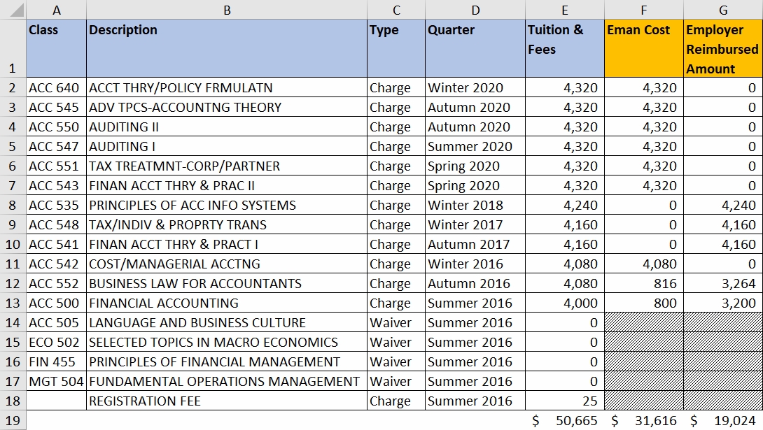 I was able to get $19,024 of the cost covered by previous employers, but paid $31,616 myself. I didn’t receive any scholarships or grants but since I’m a prolific saver I had enough set aside to be able to pay tuition costs myself without any student loans. If you throw in textbooks, my total costs were probably a little over $32,000.